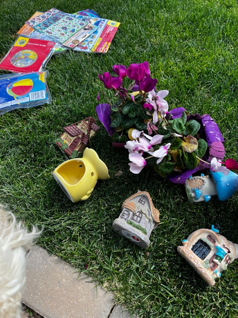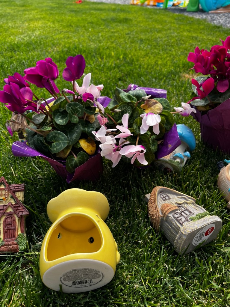 We took a trip to Dollar Tree and found all the cutest fairy houses for the garden! They also sell a great selection of seeds — two for $1.25, and hose nozzles and solar lights — all for $1.25 (although I hear prices will be rising slightly at Dollar Tree soon due to tariffs).