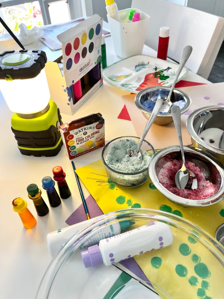 You just need granulated sugar, food coloring (a natural choice like this is our fave), some mixing bowls, and dinosaur figurines.